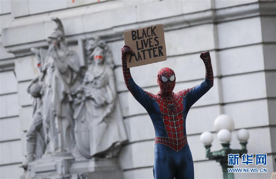 6月30日,一名打扮成“蜘蛛俠”的抗議者在美國(guó)紐約市政廳附近手舉寫有“黑人的命也是命”的標(biāo)語。由美國(guó)明尼蘇達(dá)州明尼阿波利斯市非裔男子弗洛伊德遭白人警察暴力執(zhí)法而死一事引發(fā)的各種抗議活動(dòng)仍在紐約持續(xù)進(jìn)行。新華社記者王迎攝