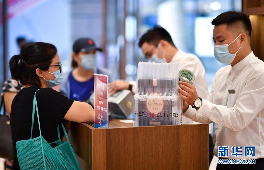 7月1日,??谌赵聫V場免稅店的工作人員為顧客打包酒類商品。當(dāng)日,海南開始實施調(diào)整后的離島免稅購物政策。海南離島旅客每年每人免稅購物額度提高至10萬元,電子消費(fèi)產(chǎn)品等7類新增商品開售。新華社記者郭程攝