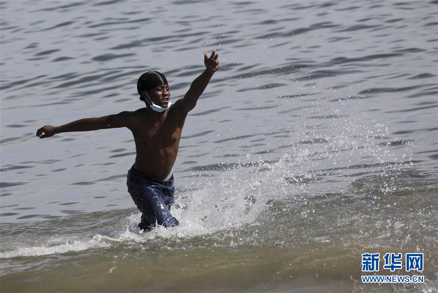7月1日,人們在美國紐約科尼島戲水。當日,美國紐約市屬八處海灘正式重新準許民眾游泳,救生員也同時上崗。新華社記者王迎攝