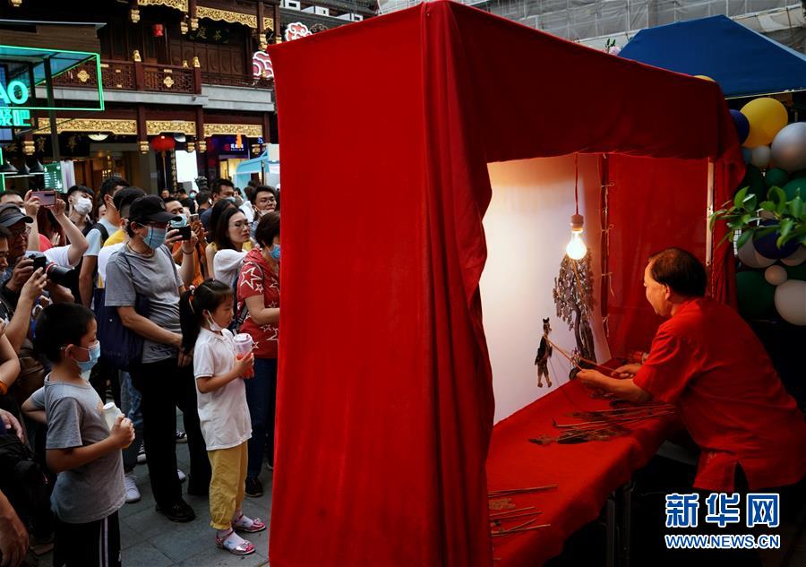 7月3日,游人在上海豫園中心廣場上觀看皮影表演。從7月第一個(gè)周末起,上海豫園原有的“豫園六點(diǎn)半”集市全面升級,煥彩燈光、演藝活動和花車集市全線更新,讓市民和游客在觀燈、觀人、觀演的沉浸式體驗(yàn)中,享受夏日特色的“食玩”樂趣。新華社記者 劉穎 攝