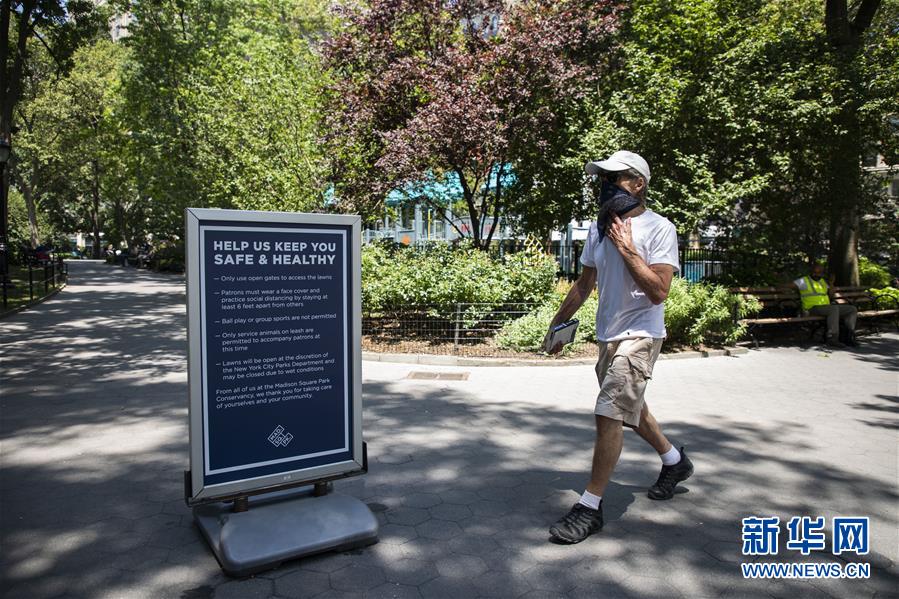 7月6日,行人走過美國(guó)紐約一處公園內(nèi)的提示牌,上面寫有防疫須知和公園管理規(guī)定。