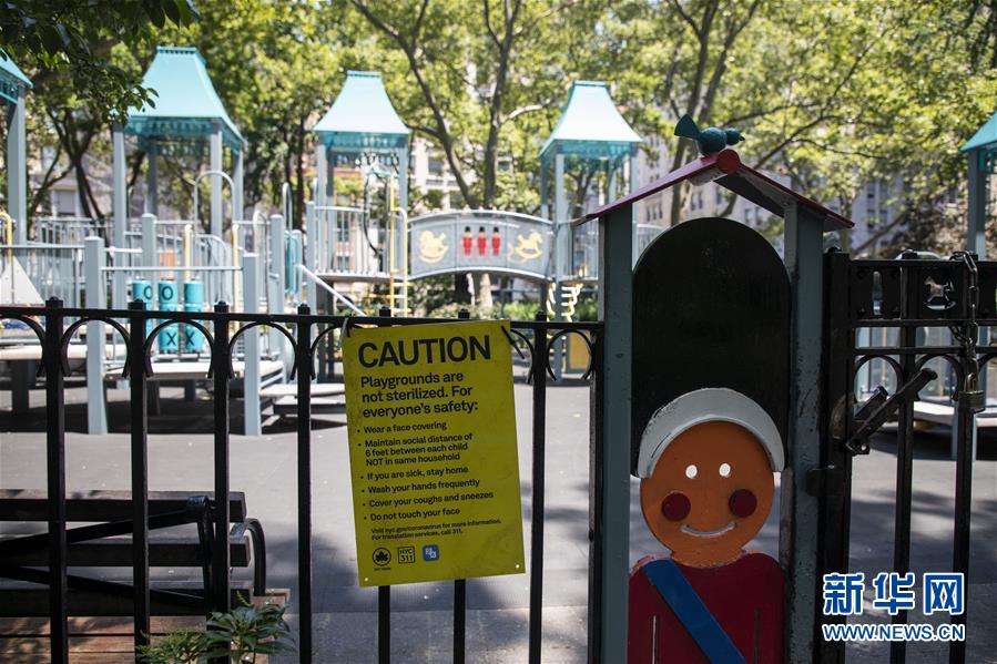 7月6日,美國(guó)紐約一處兒童游樂園的入口貼著防疫提示。新華社記者王迎攝