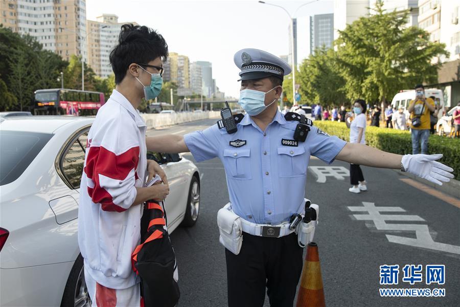7月7日,在位于北京的中國人民大學附屬中學考點外,北京市公安局公安交通管理局海淀交通支隊中關村大隊交警殷宏偉(右)指揮前來送考生的車輛有序停好,引導考生迅速前往考點。當日,2020年高考拉開帷幕。新華社記者沈伯韓攝