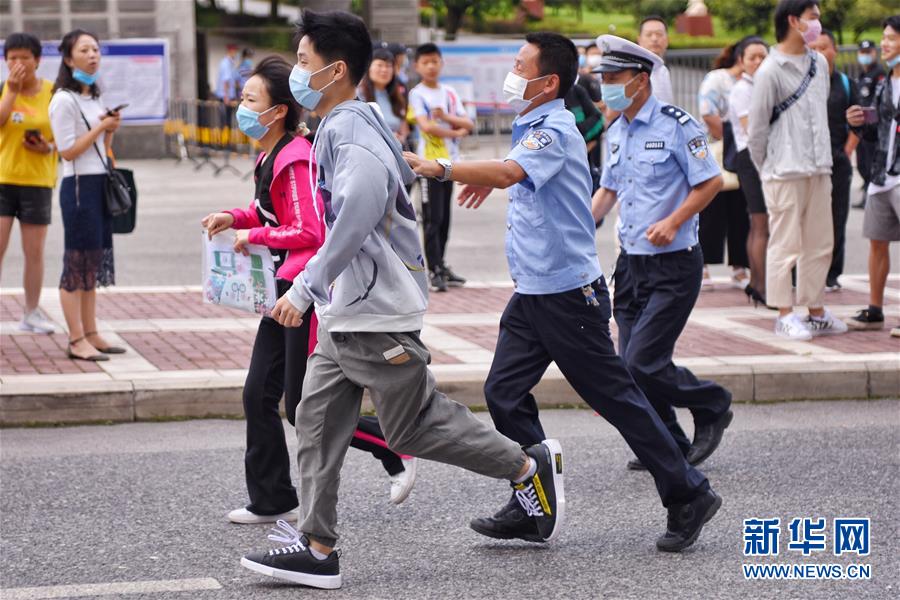 7月7日,在貴州省六盤(pán)水市第三中學(xué)考點(diǎn)外,兩名考生走錯(cuò)考場(chǎng),警察緊急安排車(chē)輛送他們前往正確的考場(chǎng)。當(dāng)日,2020年高考拉開(kāi)帷幕。新華社記者劉續(xù)攝