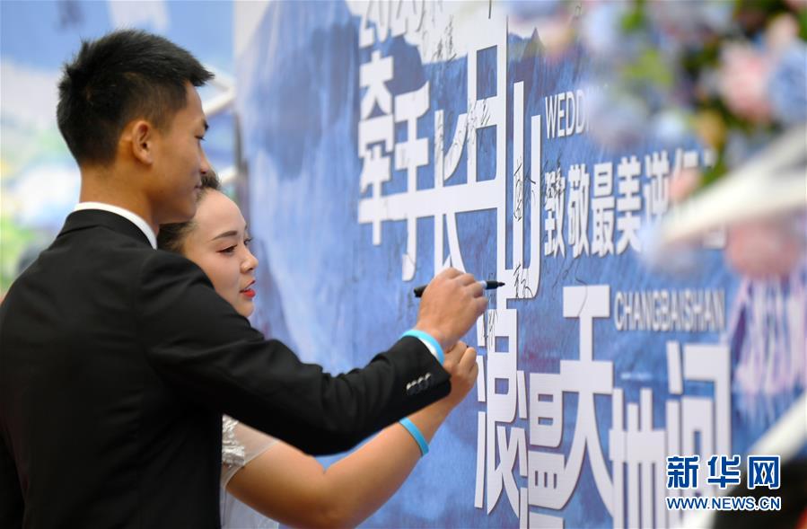 7月8日,一對新人在集體婚禮儀式上簽名。新華社記者林宏攝