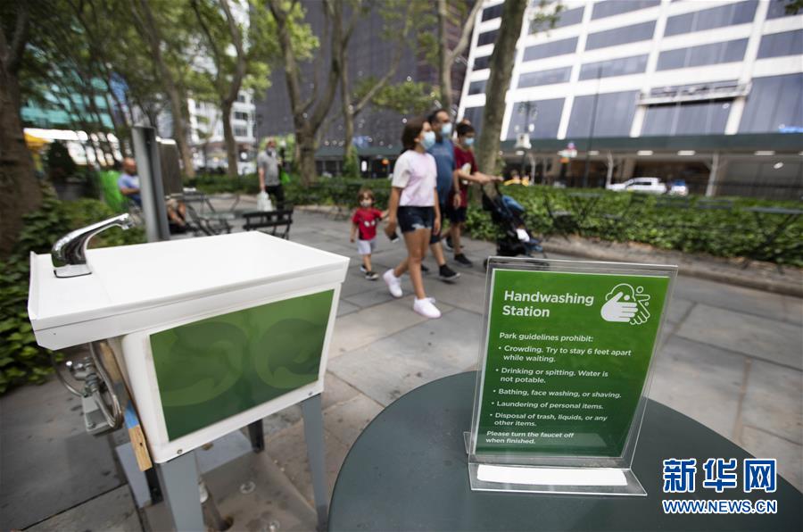 7月8日,行人從美國(guó)紐約布萊恩特公園的洗手設(shè)施旁經(jīng)過(guò)。美國(guó)約翰斯·霍普金斯大學(xué)8日發(fā)布的新冠疫情最新統(tǒng)計(jì)數(shù)據(jù)顯示,美國(guó)累計(jì)確診病例超過(guò)300萬(wàn)例。數(shù)據(jù)顯示,截至美國(guó)東部時(shí)間8日11時(shí)34分(北京時(shí)間23時(shí)34分),美國(guó)累計(jì)確診病例3016515例,累計(jì)死亡病例131594例。新華社記者王迎攝