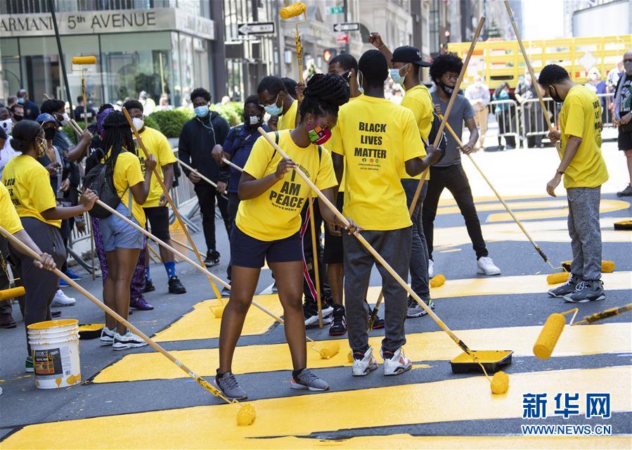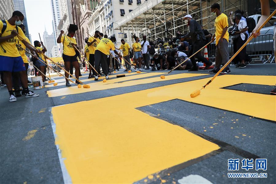 7月9日,在美國紐約第五大道特朗普大廈前,人們涂寫“黑人的命也是命”標語。當(dāng)天,數(shù)十人在紐約第五大道特朗普大廈前的路面上涂寫“黑人的命也是命”標語。紐約市計劃在多處地點涂寫“黑人的命也是命”標語。新華社記者王迎攝