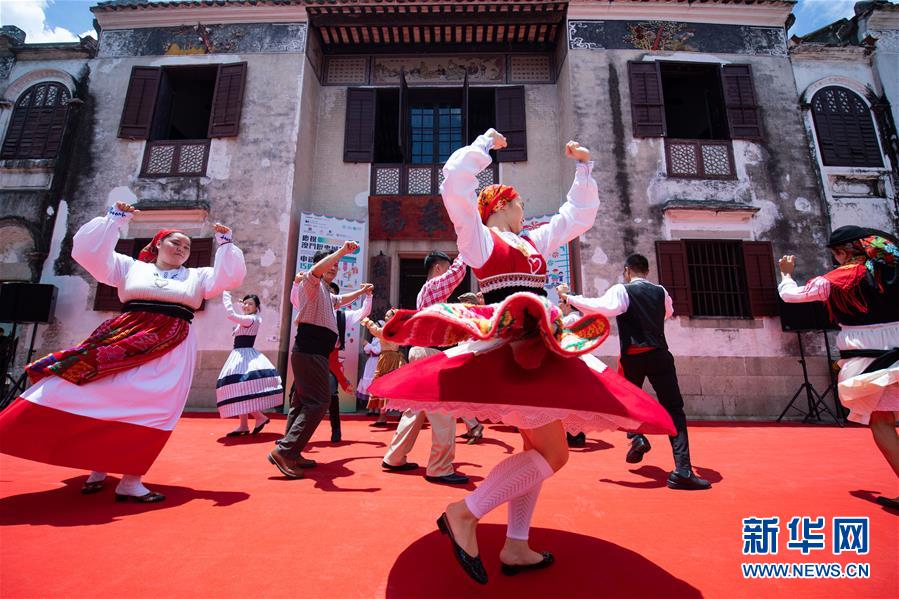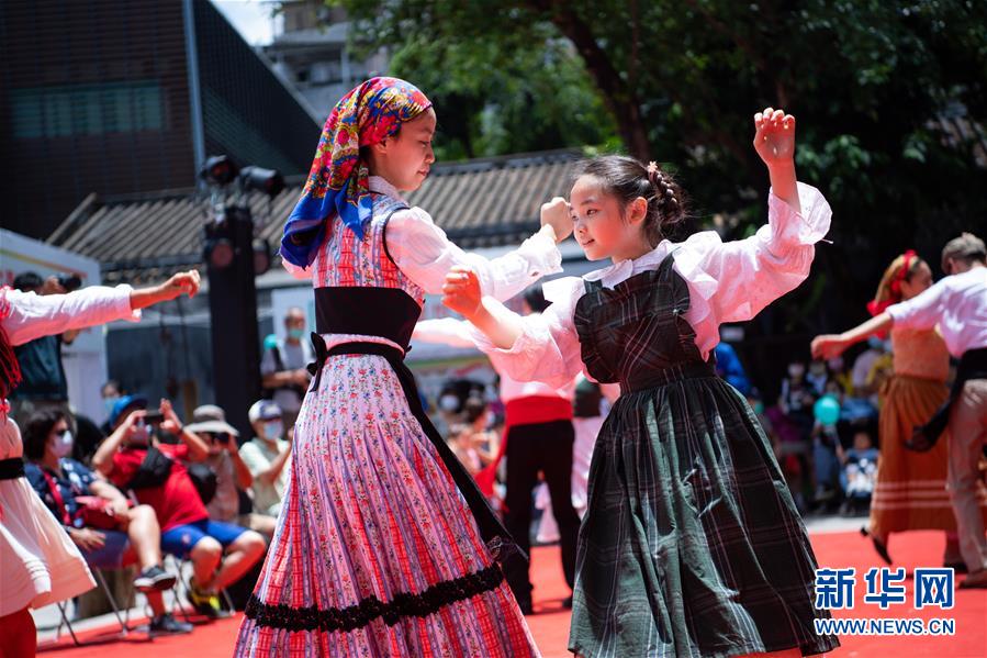 7月11日,演員在“慶祝澳門(mén)歷史城區(qū)申遺成功15周年嘉年華”上表演土風(fēng)舞。新華社記者張金加攝