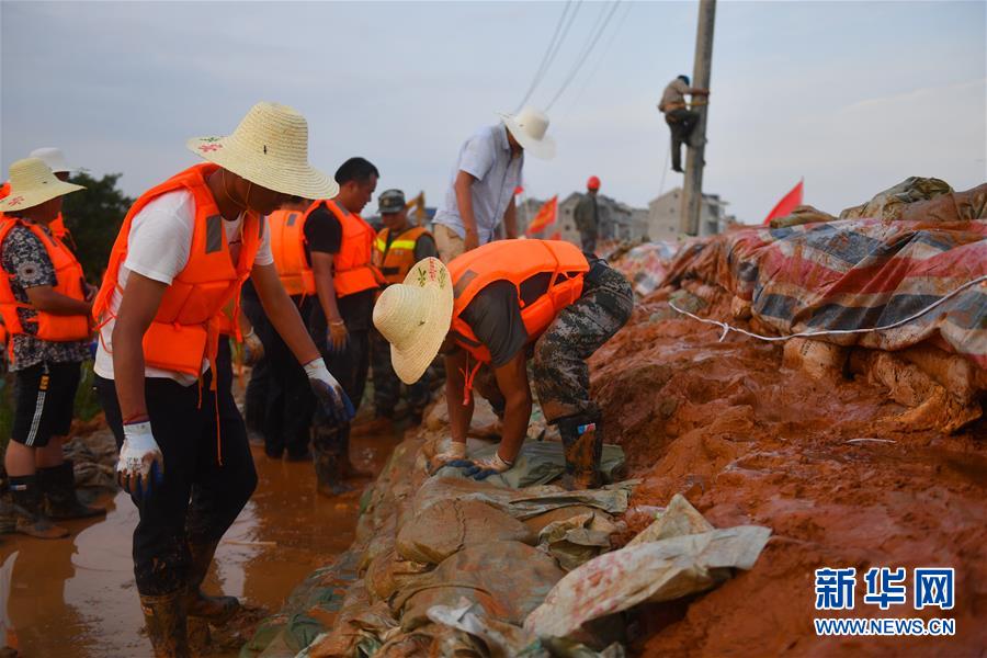 在江西鄱陽(yáng)縣昌江圩,武警江西總隊(duì)機(jī)動(dòng)支隊(duì)的工作人員和當(dāng)?shù)卮迕褚黄鸺庸疼椎蹋?月12日攝)。新華社記者 胡晨歡 攝