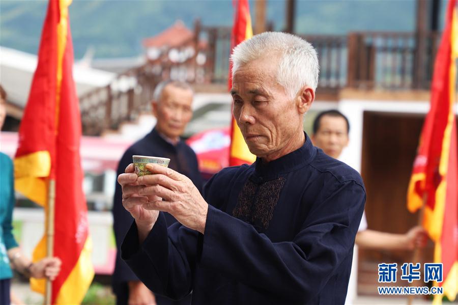 7月4日,浦源村民展示魚祭習(xí)俗。魚祭習(xí)俗是為死去的鯉魚舉行送葬儀式,是浦源村特有的習(xí)俗。新華社記者 姜克紅 攝