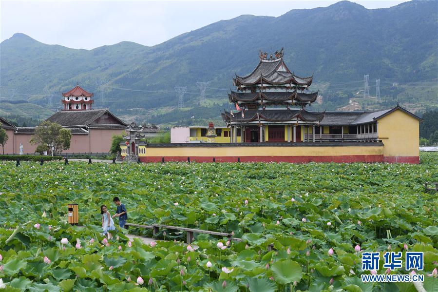 7月3日,浦源村鯉魚(yú)溪公園內(nèi)荷花盛開(kāi),吸引游人前來(lái)觀賞(無(wú)人機(jī)照片)。新華社記者 姜克紅 攝