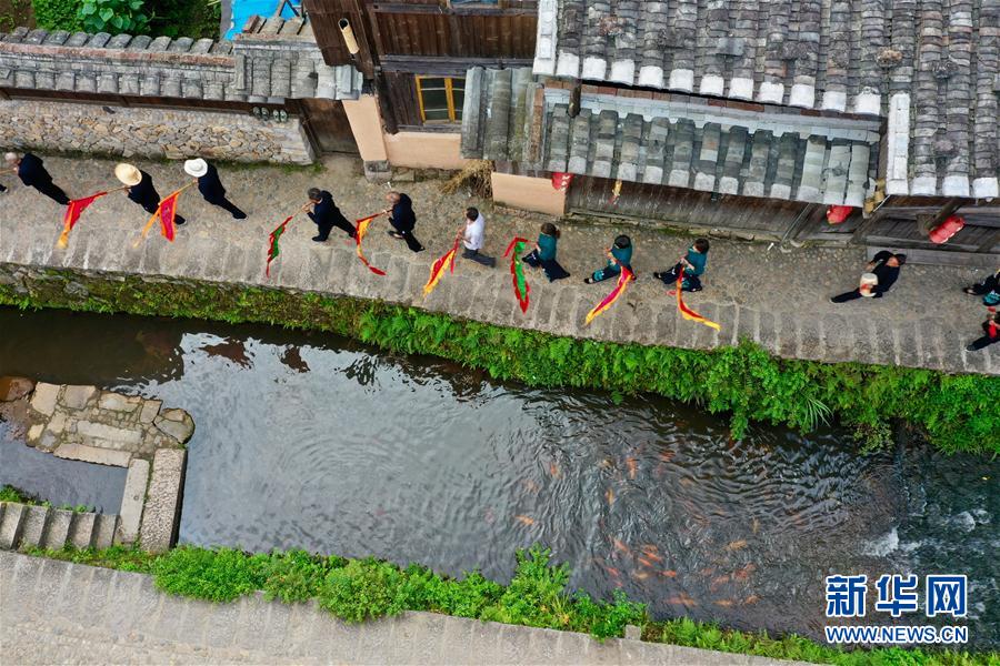 7月4日,浦源村民展示魚祭習(xí)俗(無(wú)人機(jī)照片)。魚祭習(xí)俗是為死去的鯉魚舉行送葬儀式,是浦源村特有的習(xí)俗。新華社記者 姜克紅 攝
