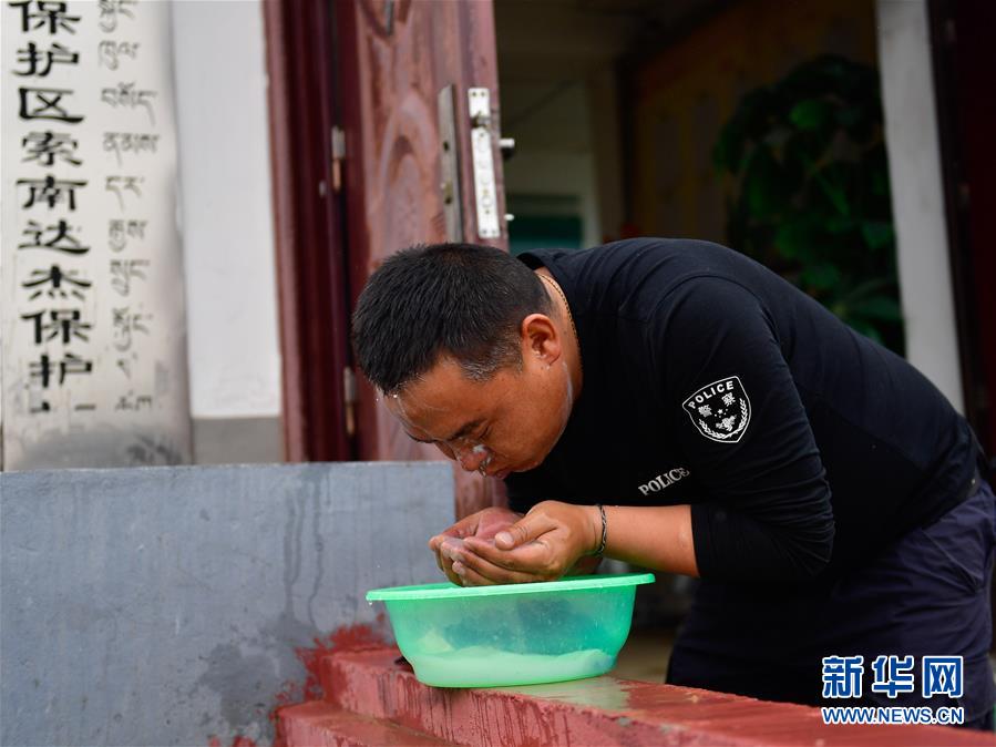 在可可西里索南達杰保護站,龍周才加在洗漱(6月30日攝)。新華社記者 張龍 攝