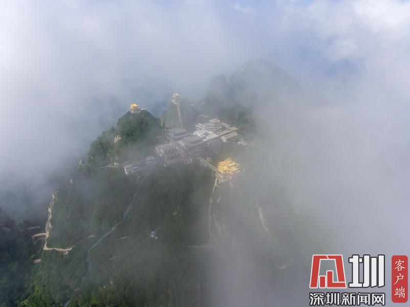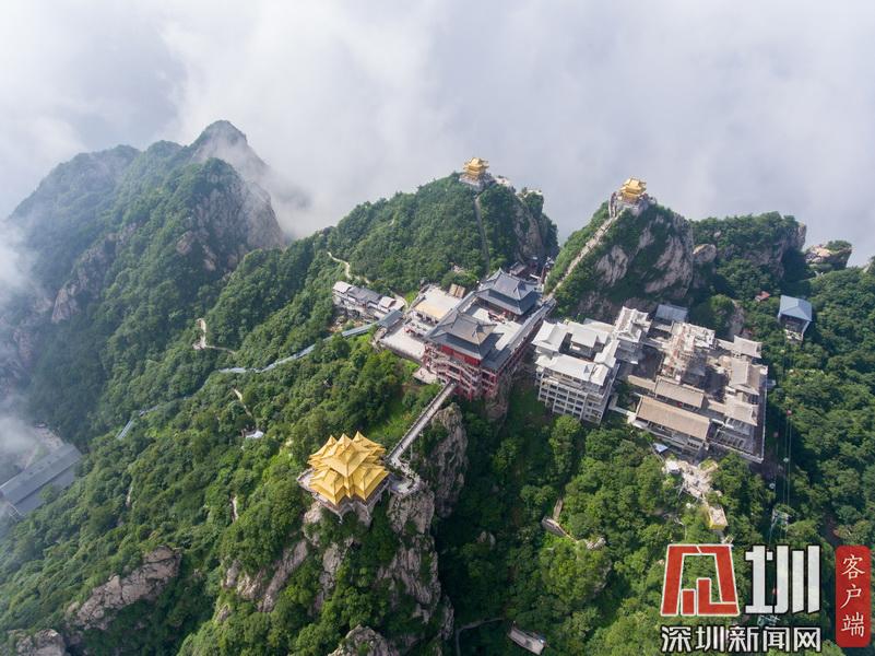 在海拔2217米的山頂上,矗立著3座明清皇家宮殿建筑風(fēng)格的建筑,山峰高聳、山谷深不見(jiàn)底,這些建筑群宛如“漂浮”在云端,巧奪天工,似人間仙境。