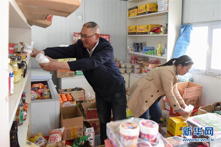 在索爾庫里宿營地,鐵路工人趙桂建(左)幫助妻子整理“白皮列車”上平價(jià)商店的商品(7月19日攝)。新華社記者 丁磊 攝