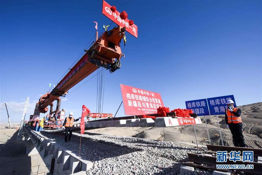 中鐵一局的施工人員在格庫鐵路新疆段鋪設(shè)最后一組軌排(7月21日攝)。新華社記者 丁磊 攝