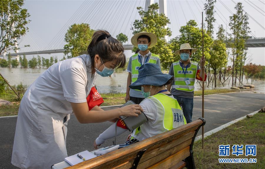 7月24日,在武漢青山江灘羅家港防汛值守哨棚旁,武昌區(qū)楊園街社區(qū)衛(wèi)生服務(wù)中心醫(yī)務(wù)人員為巡堤員測量血壓和心率。從7月6日開始,該中心醫(yī)務(wù)人員攜帶醫(yī)藥箱和消毒器具每天兩次往返于3.7公里的長江岸堤,為巡堤員測量血壓、監(jiān)測體溫,并宣傳防疫知識。新華社記者 肖藝九 攝