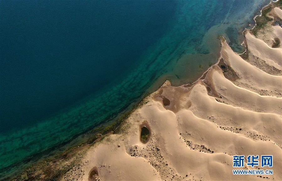 這是青海湖沙島一角(7月28日攝,無人機(jī)照片)。盛夏傍晚,位于青海湖東北部的沙島,島內(nèi)湖泊星羅棋布,沙丘連綿起伏,風(fēng)景別致。金沙與湖水掩映,在陽光的勾勒下形成一幅美麗的畫卷。新華社記者張宏祥攝
