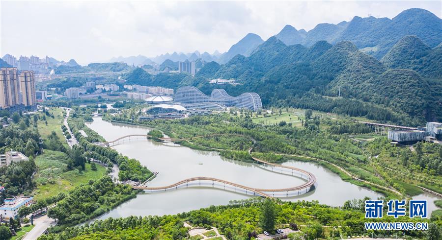 六盤水明湖國家濕地公園風景(無人機照片,6月17日攝)。新華社記者陶亮攝