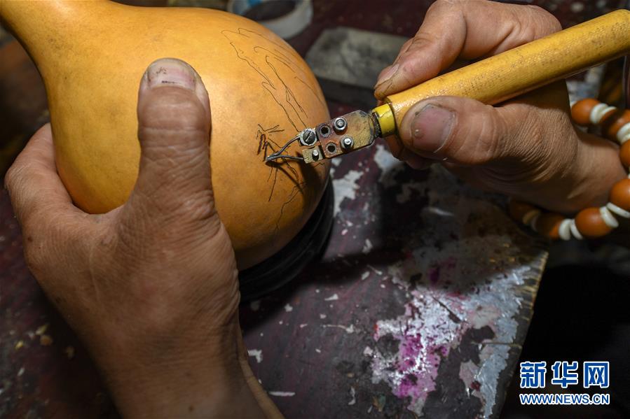 8月5日,侯景偉在葫蘆上進(jìn)行創(chuàng)作。今年55歲的吉林四平人侯景偉自幼與家人學(xué)習(xí)雕刻、烙畫藝術(shù)。經(jīng)過多年潛心研究,他將浮雕和烙畫工藝相結(jié)合,通過拋光、起稿、雕刻、烙燙、套色等十余道工藝,制作展現(xiàn)傳統(tǒng)文化、民俗故事的葫蘆工藝品。2020年,侯景偉被評(píng)為四平市非物質(zhì)文化遺產(chǎn)項(xiàng)目侯氏葫蘆雕刻烙畫代表性傳承人。他說:“希望有更多人加入到非遺傳承隊(duì)伍中,讓小葫蘆‘講’出更多民俗故事。”新華社記者張楠攝