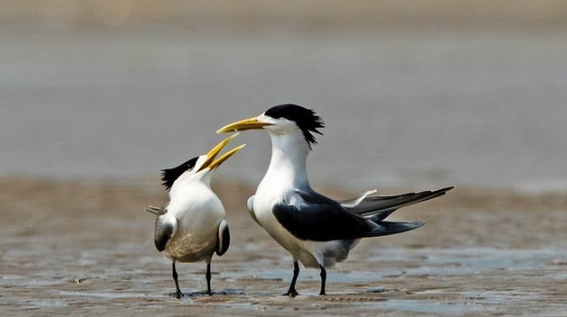 眼下正是大鳳頭燕鷗繁育的時(shí)節(jié),在福建閩江河口濕地核心區(qū)鱔魚灘的沙洲上,大鳳頭燕鷗正相互嬉戲。