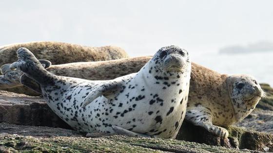 在山東省長島縣釣魚島景區(qū)附近海域,幾只斑海豹趴在海中的礁石上曬太陽,憨態(tài)可掬。
