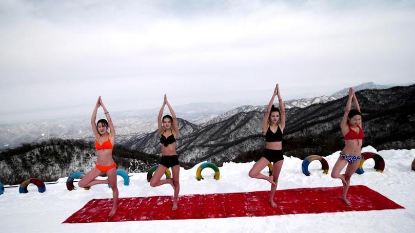 1月30日,河南欒川伏牛山滑雪場(chǎng)內(nèi),幾名比基尼美女寒冬天氣里在山頂練瑜伽、泡溫泉。