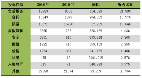 從投訴性質(zhì)看,2016年受理的投訴中,反映最突出的是售后服務(wù)問題,18289宗,占21.88%;其次是合同問題,13849宗,占16.57%;再就是質(zhì)量問題,13071宗,占15.64%;三大性質(zhì)類別的投訴比率都超過了10%。虛假宣傳問題、安全以及假冒問題,分別有3365宗、3231宗和1882宗,所占比率都低于5%。如圖3所示。