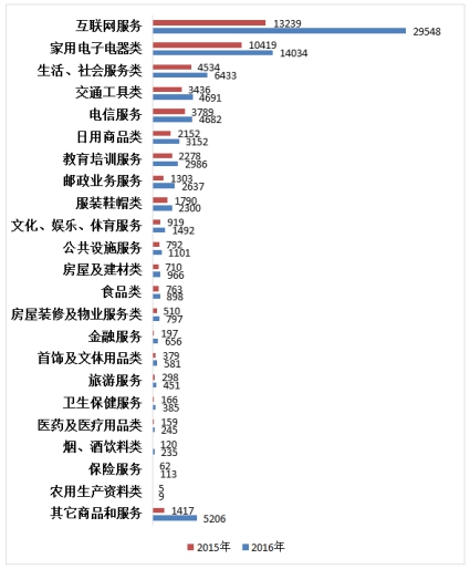 表2:商品和服務(wù)大類投訴量變化表(單位:宗)