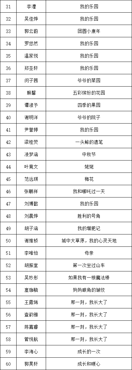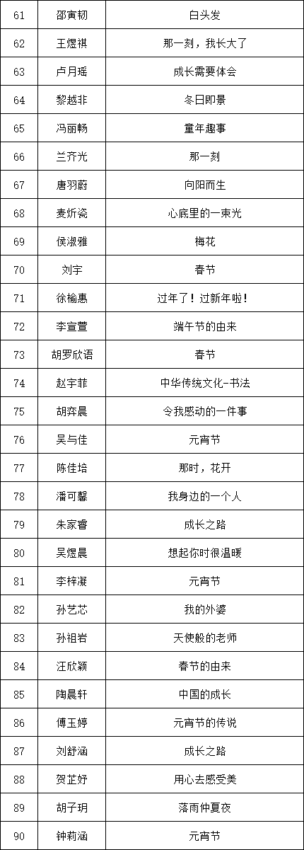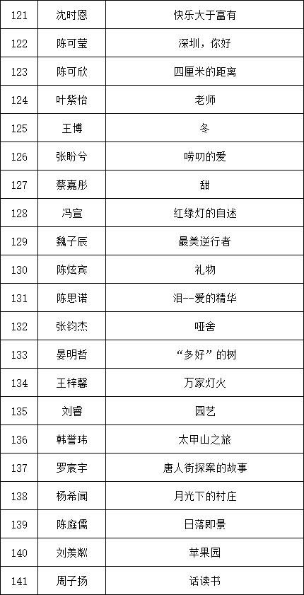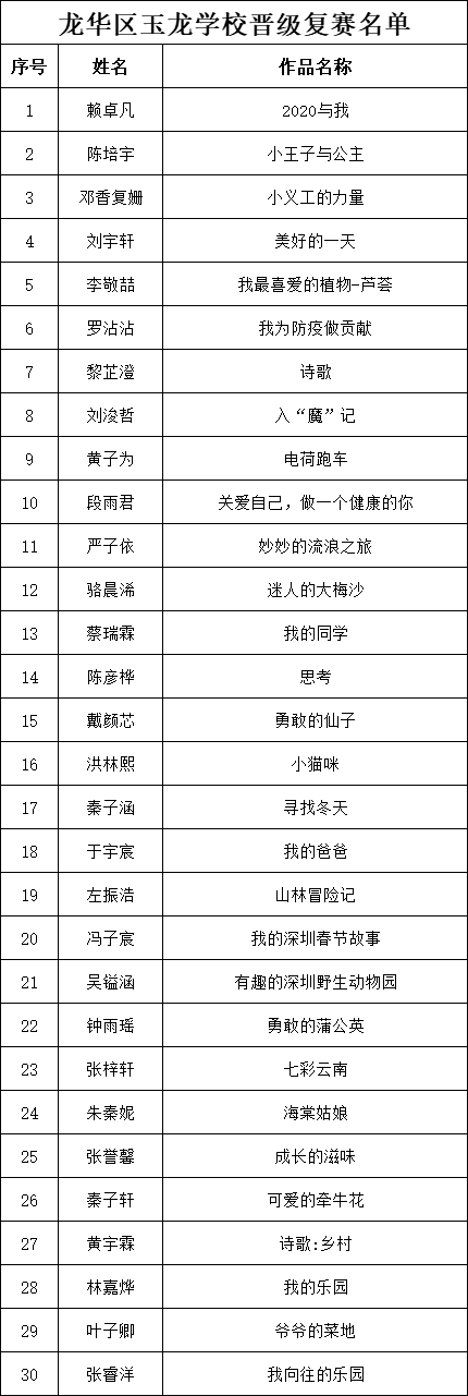 自2021年1月,活動征稿啟動以來,獲得了深圳市廣大中小學生、教師、文學愛好者的熱烈響應積極參與,吸引了深圳百余所學校的上萬人關注報名?,F公布龍華區(qū)玉龍學校專場晉級復賽名單如下: